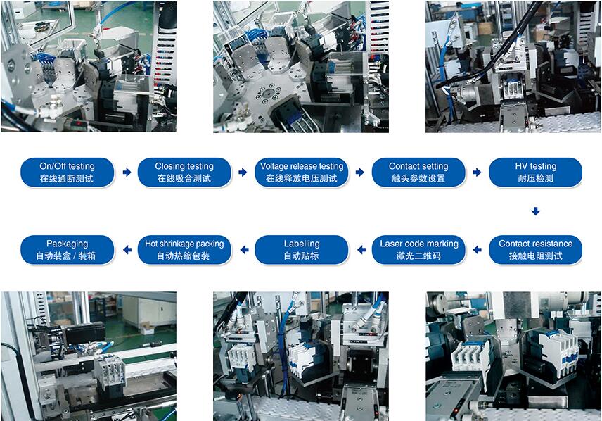 楚天光電激光完成交 / 直流接觸器的產(chǎn)品半自動裝配,采用人工、部件裝配半自動工裝、全自動螺絲裝配機(jī)相結(jié)合的模式。自動性能指標(biāo)測試,包含通斷,吸合、釋放電壓、保持功耗、觸 頭參數(shù)、耐壓、主觸頭接觸電阻等。產(chǎn)品包裝:主要包含激光二維碼、產(chǎn)品貼標(biāo),裝盒、熱縮包裝等工序。其中激光二維碼關(guān)聯(lián)到單件產(chǎn)品的所有測試參數(shù)。實現(xiàn)物流傳輸自動化。